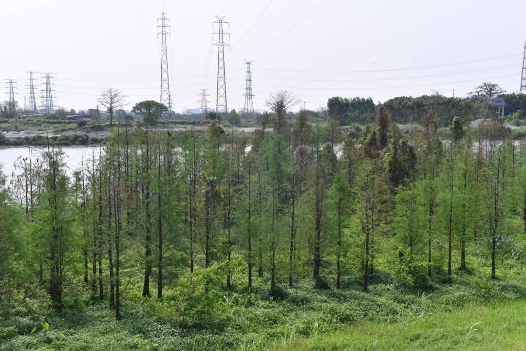 如今,龙江镇累计种植落羽杉超8300棵,形成三大落羽杉连片种植区域:甘竹溪西岸万安至麦朗段、高滘水闸至大坝段、龙江智能家居产业园堤外滩涂地,连片绿意串联起环两江沿岸的生态绿廊,让“河畅、岸绿、景美”的生态画卷在龙江徐徐铺展。