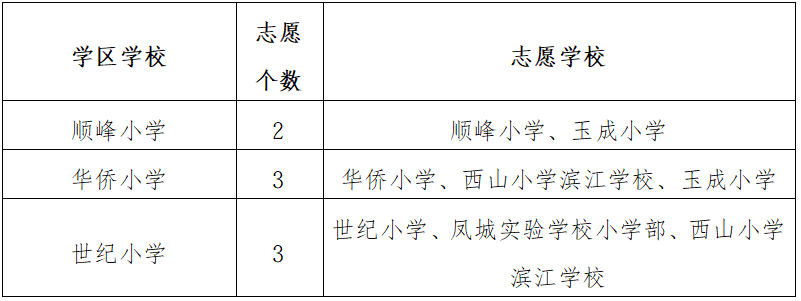 【注:①请认真阅读招生学区划分方案(附件2),每一名适龄儿童只能到一所户籍所属学区的公办小学报名;因家长选错学校而导致无法录取的,家长自行承担责任。②西山小学、本原小学、世纪小学、顺峰小学、华侨小学学区的适龄儿童只需选择户籍所属学区学校进行预报名,暂无需填写志愿。】