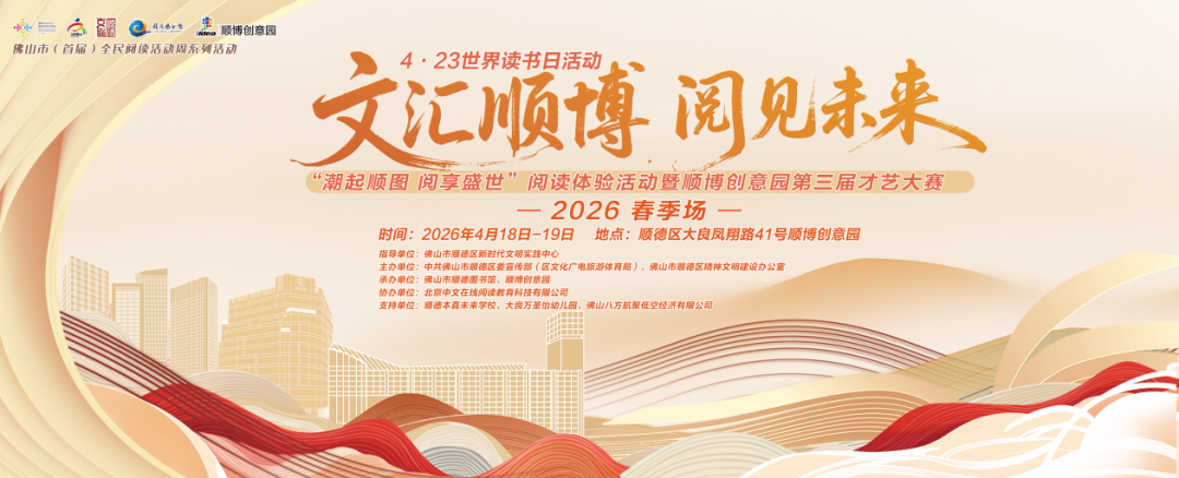 惊喜彩蛋高能来袭!4月第四周为“全民阅读活动周”,4月18日-19日,顺德图书馆将携手顺博创意园重磅打造“文汇顺博 阅见未来”——4・23世界读书日活动暨“潮起顺图 阅享盛世”阅读体验活动(2026春季场),超有料的书香盛宴即将上线~